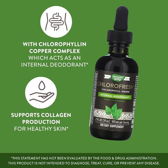 • مزيل عرق كلوروفريش من نيتشرز واي عبارة عن مركب كلوروفيلين سائل مستخلص من نباتات فاخرة تستخدم كمزيل عرق داخلي.